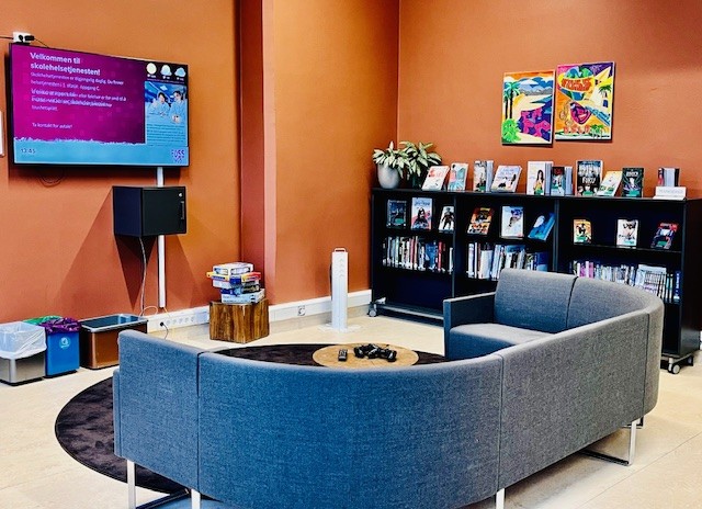 Skolebiblioteket er delt inn i tre ulike soner - skranke, chillerom og grupperom. I grupperommet har vi symaskiner og i chillerommet har vi mini-scene og egen sofakrok for gaming-og brettspill.