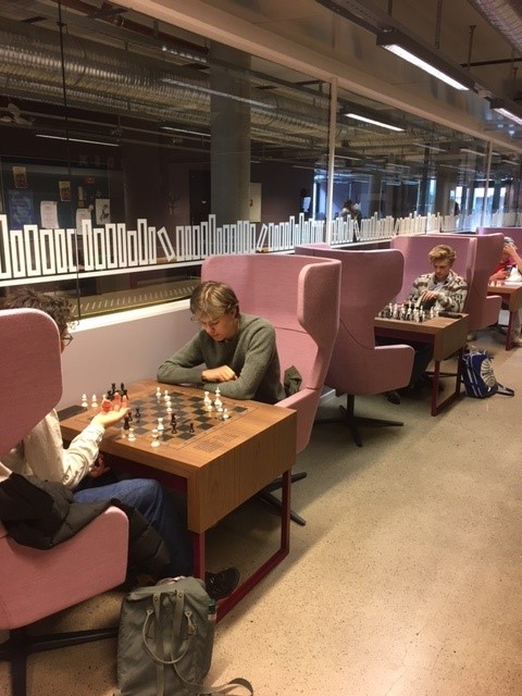 I skolebiblioteket er det hyggelige sittegrupper og gode studiemuligheter. Har du lyst til å spille sjakk så kan du gjøre det ved våre spesialdesignede sjakkbord.